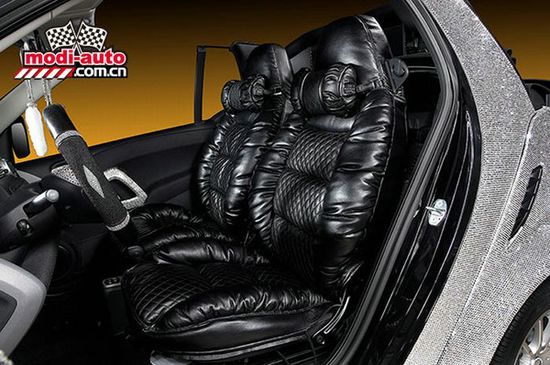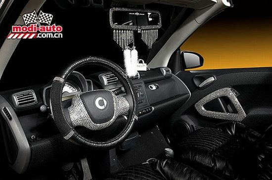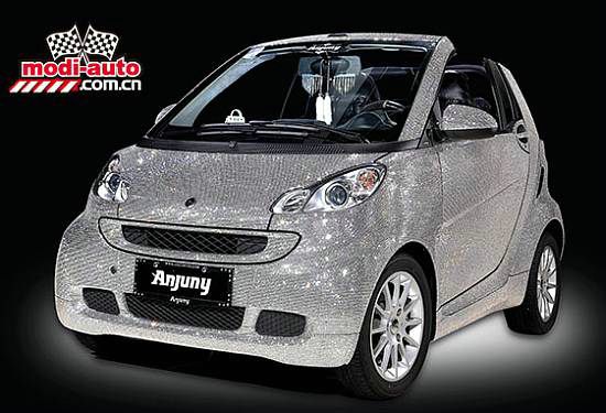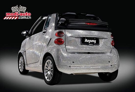 Anjuny the luxury car accessory brand by ZMC, blinged out this Smart car with 280,000 Swarovski crystals for the Chinese market. The car isn’t just crystal-covered on the outside, the interior is detailed with crystals as well. Not a word about price.