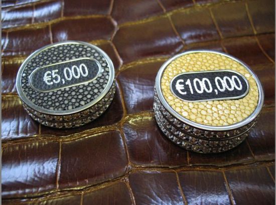London-based Geoffrey Parker maker of the finest games on the globe, introduced a luxury poker set for the gambling elite costing whooping $7.5 million. Featuring an estimated 22,364 precious stones in all, a total of 1,012 carats, the set comes housed in a genuine alligator skin case fitted with 18 karat white gold combination locks and hardware. The edge of each chip is set with precious stones – white diamonds for the white chips, sapphires for the blue, rubies for the red, emeralds for the green and black diamonds for the black.