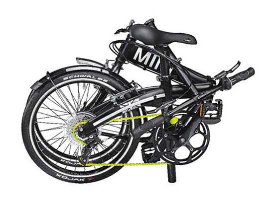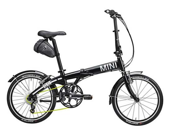 The MINI Folding Bike presents itself as a genuine high-tech vehicle: high-quality components, a light-weight aluminium frame and a clever folding mechanism make the trendy bike the ideal companion while travelling. The bike can be folded and unfolded in just a few seconds. The bike is folded along the crossbar and handlebars. In addition the saddle can be retracted and the pedals be folded up. This makes the bike extremely easy to handle whilst saving space. Fitted in a sleeve under the saddle is a practical transport bag. The MINI Folding Bike can easily match the riding characteristics of a “normal” bike. Weighing less than 11 kilos and equipped with 8 gears and 20-inch wheels, it is quick and versatile. The teflon-coated chain prevents annoying soiling caused by chain oil and reduces the wear and tear on the components. The comfortable gel saddle ensures comfort. Thanks to the front and rear mudguards, you can carry on peddling regardless, even in the rain. Good visibility on the road is guaranteed by the accompanying reflectors.