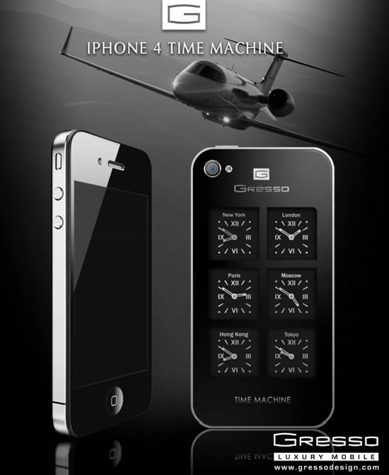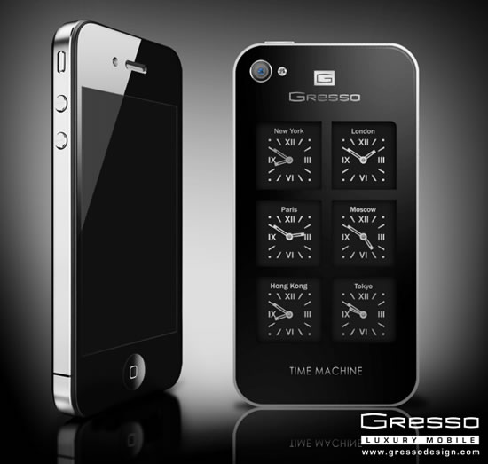 Luxury mobile phone manufacturer Gresso, unveiled its new exclusive project, the iPhone4 Time Machine. Designed for people living in the rhythm of world time, the iPhone4 Time Machine houses six independent mechanical Swiss watches behind the smartphone’s case protected by a mineral glass with diamond coating. Priced at $6,000