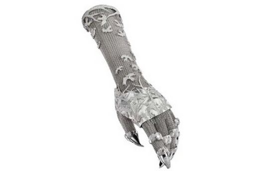 Fashion icon Daphne Guinness has collaborated with jewelry designer Shaun Leane to create a striking and innovative piece of body “armor”. The glove, entitled “Contra Mundum”, Latin for “Against The World” is made of hand crafted chain-mail and 5000 pave diamonds.