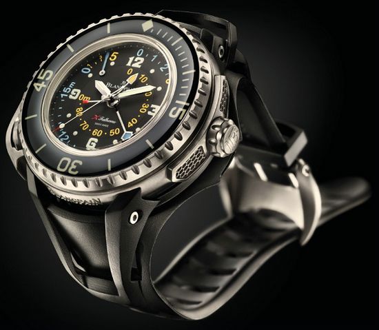 Swiss watch maker Blancpain just released the X Fathoms dive watch, a derivative of their Fifty Fathoms collection, at Dubai Aquarium & Underwater Zoo in the Dubai. The new super diver is capable of measuring both current and maximum depths. The case is made of satin-brushed titanium, water-resistant to 300 meters, with the most complex injected rubber strap ever conceived, according to Blancpain. Inside the watch is a Blancpain made caliber 9918B automatic that has 120 hours of power reserve .
