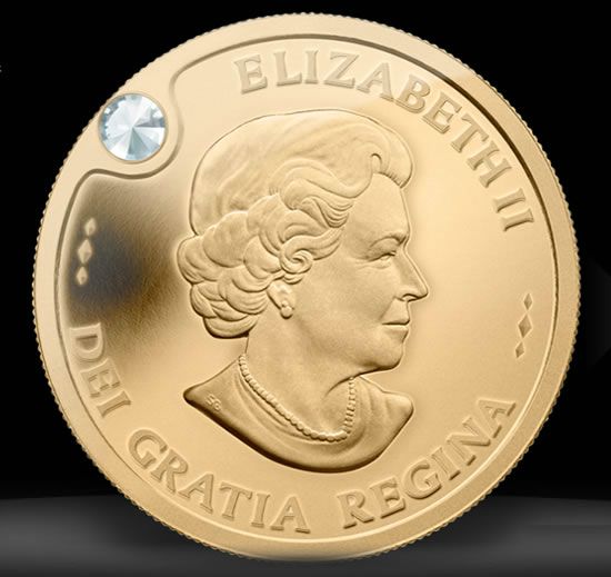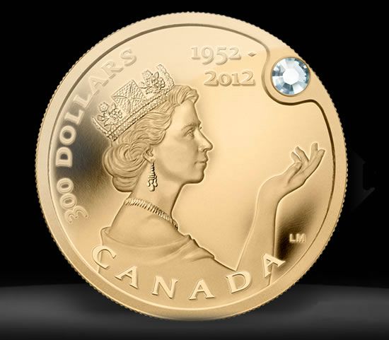 $300 Pure Gold Coin – The Queen’S Diamond Jubilee 1952-2012 ; Using a proprietary process, a certified Canadian diamond is locked inside the coin’s rim as the coin itself is struck. This allows the proud owner of this innovative coin to admire the diamond’s brilliance on either side of a coin fashioned of 99.999% pure gold; the purest of its kind in the world.