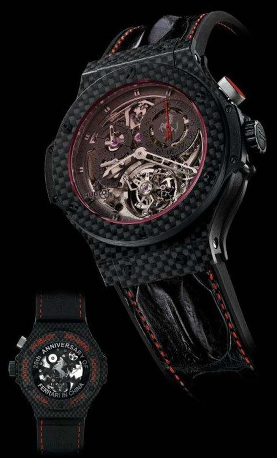 Luxury Swiss watch brand, Hublot partnered with Ferrari to introduce the Big Bang Tourbillon Chrono Ferrari timepiece, to mark the 20th anniversary of the first Ferrari ever sold in China. Limited to just 20 pieces, this is the first Ferrari branded Hublot timepiece. Tech Specs after the break!