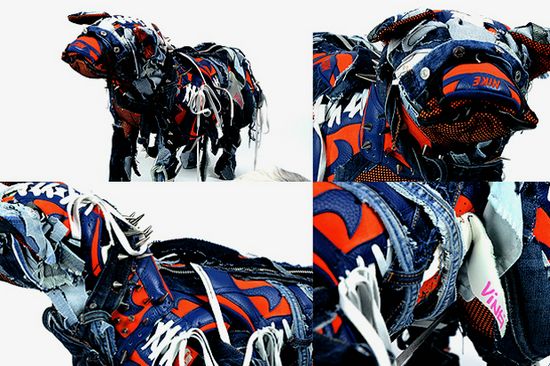 This Nike Dog created by English designer Vinti Andrews gives a whole new meaning for “Walking the Dog”. Made out of classic Nike sneakers including Air Force 180s, Air Max 1s and Dunk Lows, these Nike Dog sculptures are adorned with spiked collars and heavy-duty chain leads. Priced at ¥350,000 ($ 4,500 ) the sculptures are available now at BEAMS.