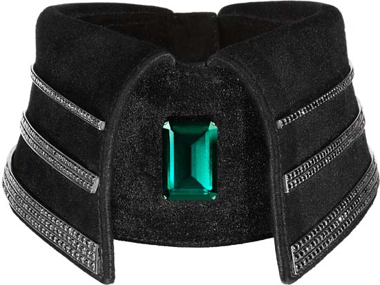 Chanel’s creative director, Karl Lagerfeld has designed a unique black diamond and emerald collar for Net-a-Porter that retails for $37,500. “I’m renowned for my love of a high collar and I wanted to create a true collector’s item with this one-off piece,” Lagerfeld told Vogue UK. The neckpiece is handcrafted from metallic-black suede, edged with pavé black diamonds and embellished with a dazzling hydrothermal emerald. The piece will be on display from June 28th – July 4th at the the Brilliant exhibition of diamonds at Masterpiece London, accompanied by a hand-signed sketch from the icon himself. A percentage of profits from the sale will be donated to children’s cancer charity CLIC Sargent.