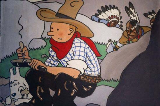 A rare 1932 cover drawing of a Tintin comic book, hand-drawn by Belgian writer and illustrator Herge, has been sold for a record 1.3m euros ($1.6 million) at auction in Paris. The “Tintin in America” cover, shows a cowboy version of Tintin and his dog Snowy eating , as axe-wielding American Indians creep up on them. “If he’d have been able to get it for less I think he would have been happy,” a friend of the anonymous buyer told Reuters. The rare cover is one of only five remaining originals by Herge – real name Georges Remi. Only two are in private hands.