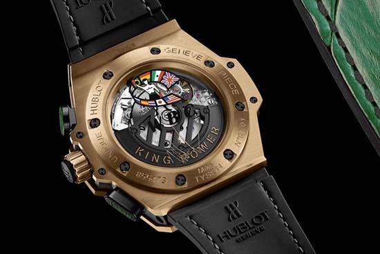 The 12 King Power WBC timepieces incorporate the iconic championship belt awarded to the world’s best fighters. The model is a fierce blend of modernism and graphic design. The case is a fusion of satin-finished 18-carat King Gold, black ceramic and titanium with a powerful 48 mm diameter. The timepieces are fitted with a HUB4100 automatic chronograph movement. The first 3-minutes of the 30-minute counter are painted in red to represent a boxing round. The WBC logo is applied on the sapphire crystal case back and reveals a cut out rotor. Each transparent case back is also signed by a different boxing legend. Finally, the timepieces are fitted with a Porosus Hornback green alligator and spare black rubber strap.