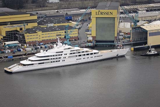 A German shipyard launched Azzam, the world’s largest private yacht. Azzam, which means dedication in Arabic, was designed by Milan-based Nauta Yachts and meticulously constructed by Lürssen Yachts in Bremen under the personal guidance of Engineer Mubarak Saad al Ahbabi. At 180 meters (or 590ft), Azzam is 17m (or 57ft) longer than Russian oligarch Roman Abramovich’s superyacht Eclipse.