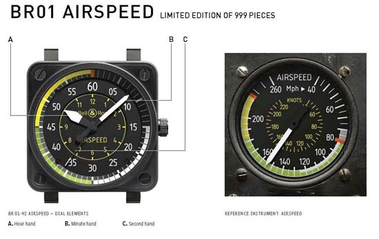 Bell & Ross designers have borrowed the graphic characteristics of the anemometer, or airspeed, to create an original and extremely legible
