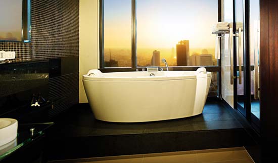 “Banyan Tree Club Room – Bathroom – The bathroom which is designed for relaxing moments, showcases twin black granite basins, a rain shower and an oversized bath with double headrests.”