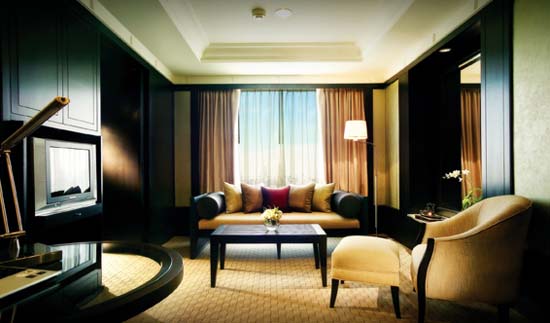“Deluxe Room – Living Area – Enjoy aromatherapy burner with daily selection of essential oils while unwinding in your room. Relax as you watch satellite news and entertainment channels on one of the two TVs, browse the newspaper or simply admire the view of the Bangkok skyline.”