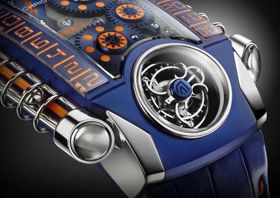 The case, rectangular with curvex profile, measures 40.8mm x 56.8mm x 15mm. The mainplate is titanium. The hours and minutes are indicated by two 4mm-diameter hollowed spheres weighing 0.100 grams that move past sapphire scales marked with thin orange Super-LumiNova graduations beneath the sapphire crystal. It is water resistant to 30 meters.
