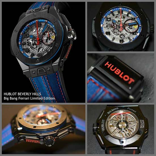 Hublot and Ferrari solidify their existing partnership by announcing a new 50-piece limited edition, the Big Bang Ferrari Beverly Hills.The Big Bang Ferrari Beverly Hills sports a 45.5-mm black ceramic case with a satin-finished black ceramic bezel, blue inner bezel and sapphire dial, which dramatically showcase the Hublot’s in-house “UNICO” caliber inside. The Ferrari logo is engraved and lacquered red on the lower push button, complementing the red seconds hand and chronograph indices. This watch has a power reserve of 72 hours and is water resistant up to 100 meters. Available now exclusively at Hublot Boutique Beverly Hills.