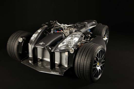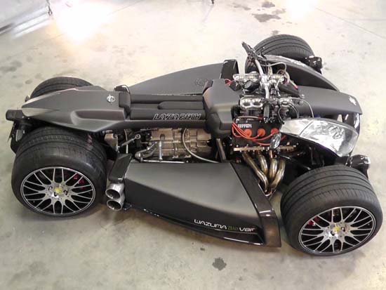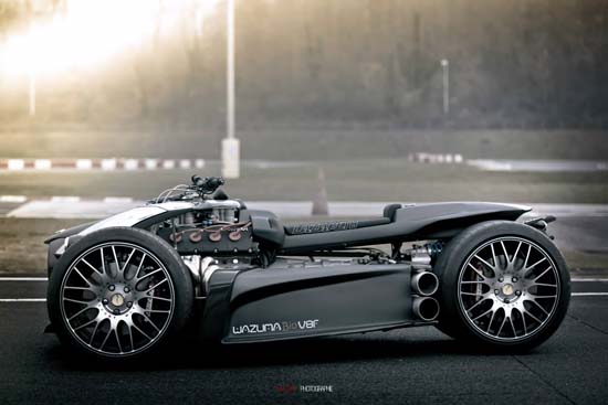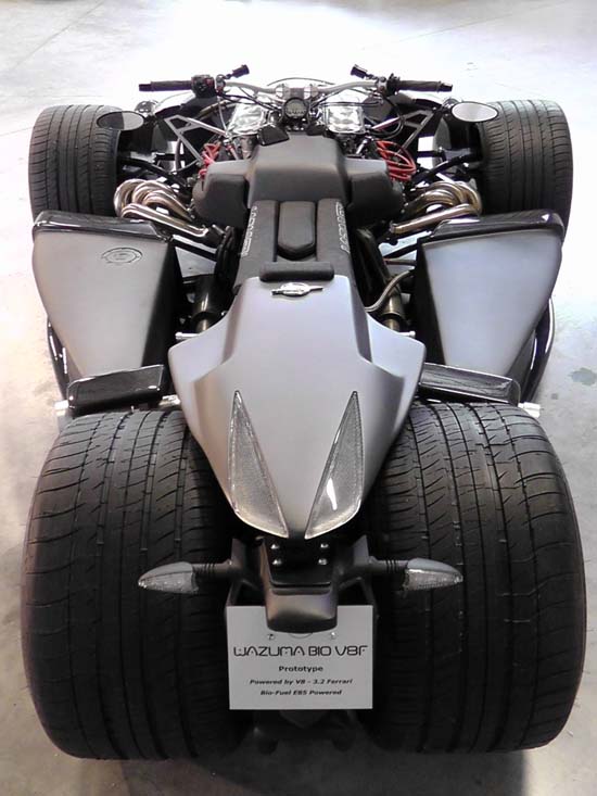 French custom car and motorcycle builder Lazareth revelead a unique masterpiece, the “Wazuma V8F Matt Edition” – a Ferrari powered motorcycle/quad fusion vehicle. The vehicle is powered by a 250hp 3.0 liter V8 Ferrari motor connected to a six speed BMW M3 gearbox in a quad that weighs only 650kg (1,433 lbs). “The machine gets specific and highly exclusive equipment like modified Momo (+Power) rims with Brembo calipers and four 324mm brake discs. The suspension system is very specific, featuring four horizontal shock absorbers, made-to-measure by EMC. Everything is enormous. For instance, the wheels are slicks 285-30ZR18 for the front and 315-30ZR18 for the rear.” No word on price from Lazareth , but ne of these custom-built toy will get you up to €200,000 ($275,260). I bet Batman is feeling really jealous right now.