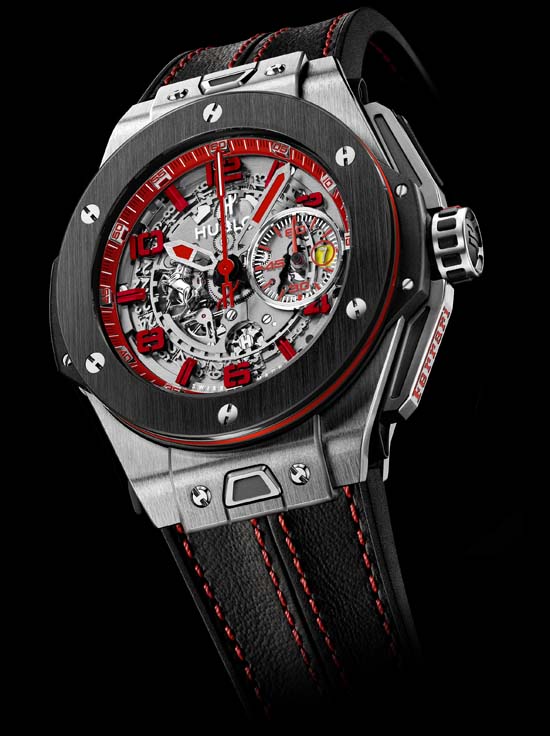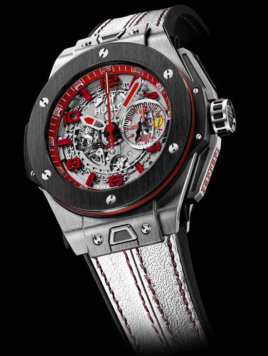Dial Sapphire with white Hublot logo transfer. Rhodium-plated Ferrari prancing horse appliqué
