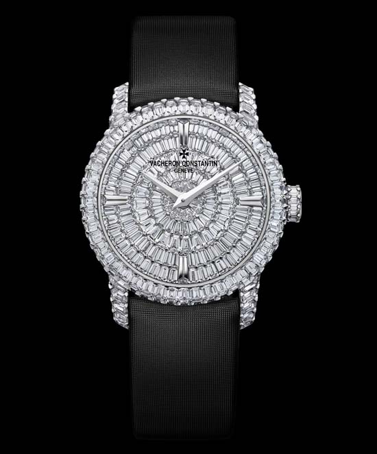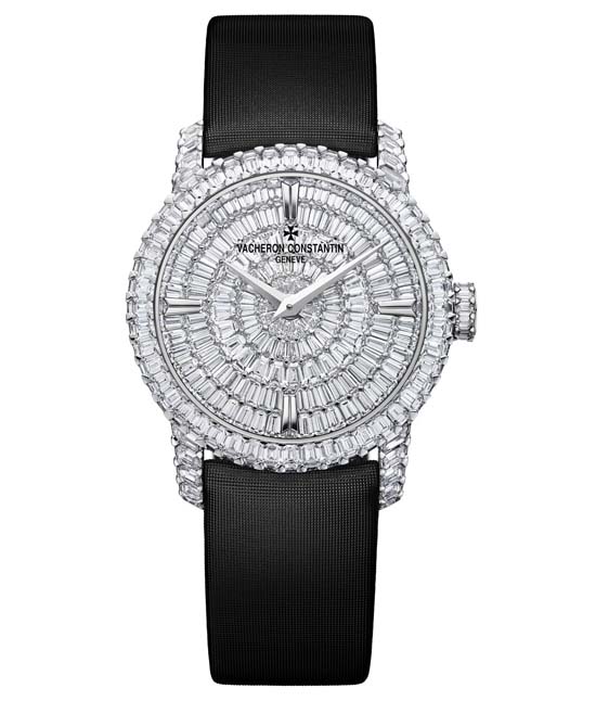 Luxury watchmaker Vacheron Constantin comes out with yet another vibrant dedication to its Patrimony collection, the high jewellery small model. The Patrimony Traditionnelle High Jewellery is available in a 35mm case or 40mm case in 18kt white gold; It has 124 baguette-cut diamonds (6.60 carats), and a diamond-set crown with 12 baguette-cut diamonds (0.17 carat). The dial is diamond-paved 18kt gold with 156 baguette-cut diamonds (weight of approx. 3.40 carats). The stunning timepiece uses a Vacheron in-house mechanical movement with 4 jewels, 33 components and vibrating at 32,768 Hertz. The novelty comes on a black satin strap with a diamond-set clasp in 18kt white gold with 12 baguette-cut diamonds (0.44 carat). The resulting shimmering effect is truly mesmerizing. The watch will be officially unveiled at SIHH 2014 exhibition in Genève. [ Reference 25760/000G-9945 ]