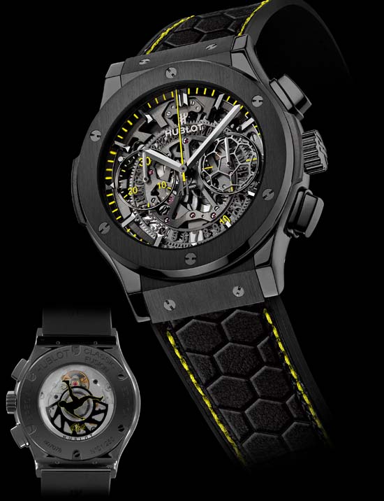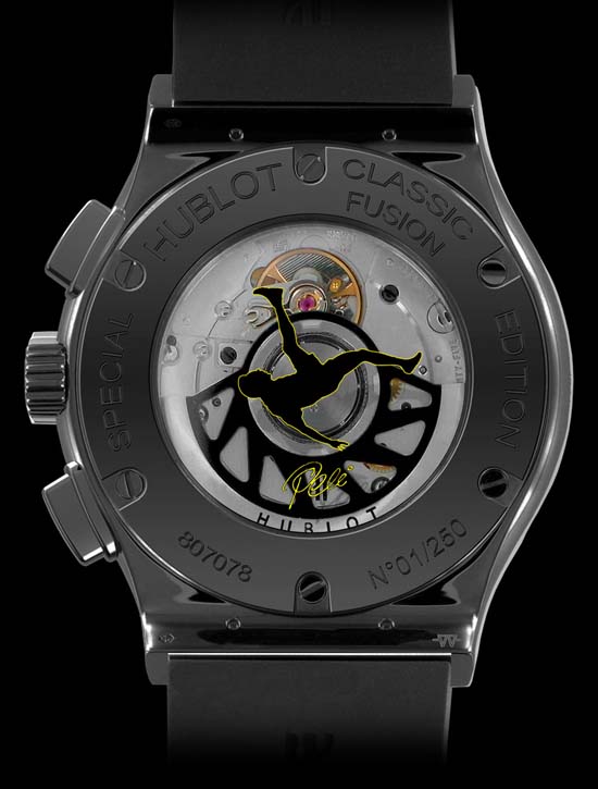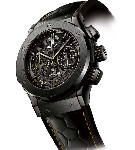 Swiss manufacturer Hublot opened its first boutique in Latin America in Rio de Janeiro, and unveiled a new limited edition watch dedicated to Pelé. The international football legend Pelé is also Hublot Ambassador for the 2014 FIFA World Cup in Brazil. Limited to just 500 pieces, the watch is a Classic Fusion Aero Chronograph with a 45 mm polished/satin-finished ceramic case, featuring a stylish soccer/football for the chrono counter at 3 o’clock. Pelé’s famous signature is found on the watch’s case back. Inside the case is the automatic mechanical Aero Hublot chronograph movement with 60 jewels, and a power reserve of 42 hours. The novelty is completed by a Black calfskin strap, embossed with football pattern, yellow stitching, and a Black PVD steel deployant buckle.