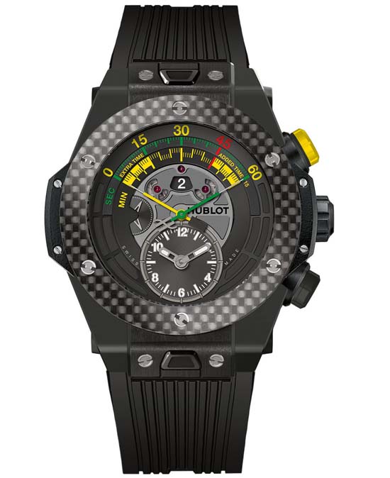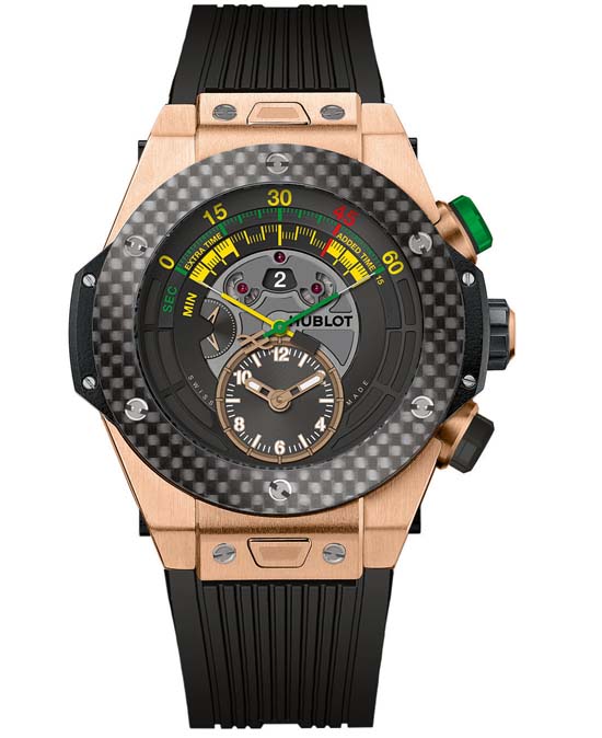 Swiss manufacturer Hublot, which is the Official Timekeeper of the Brazil World Cup, unveiled today the official watch of the FIFA World Cup Brazil 2014 with the King Pelé. The watch is available in two versions, an 18K King Gold version with carbon fibre bezel, and a black ceramic version, also with a carbon fibre bezel. The dial bears the national colours of Brazil, yellow and green – in reference to the competition’s host country. Inside is the new automatic HUB1260 manufacture movement, a bi-retrograde movement with central chrono comprising 385 components (Frequency 4 Hz, 28,800 Vib/Hour). The novelty is supplied with a structured and ribbed natural rubber strap. Full technical details after the break.