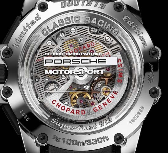 Swiss watchmaker Chopard presents the Superfast Chrono Porsche 919 Edition, in celebration of Porsche’s return to Le Mans. The COSC chronometer-certified flyback chronograph features a 45mm steel case with a sapphire case-back bearing engraved “Official Timing Partner Porsche Motorsport” inscription. Inside is the Chopard 03.05-M self-winding mechanical movement, with 28,800 vibrations per hour and a power reserve of 60 hours.The sporty dial is stamped with the 919 logo at 9 o’clock; the silver color is reminiscent of the prestigious Porsche color. Made in a symbolic number of 919 copies, the new timepiece is inspired by racing car Porsche 919 Hybrid.