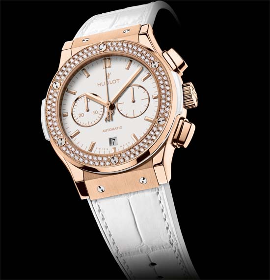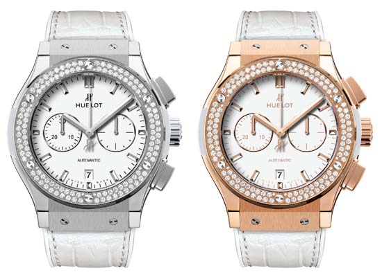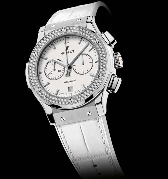 Hublot “Art of Fusion” philosophy goes all white – The Swiss manufacturer unveiled a refined Classic Fusion pure white as snow. Featuring a 42 mm case, the timepiece is available in two versions, an elegant sporty Titanium Chronograph version , and a King Gold Chronograph version, totalizing 42 white diamonds for 1.35 carat for the bezel. The Classic Fusion White Chrono is powered by a HUB1110 Self-winding movement with 35 jewels, 28,800 vph and a power reserve of 42 hours. It comes on a White alligator leather sewn onto white rubber strap with a deployant buckle. Full technical details after the break.