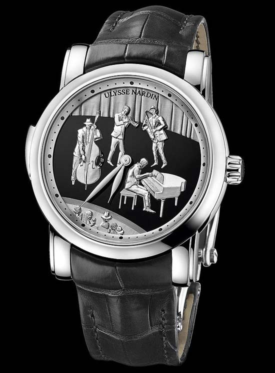 Swiss watchmaker Ulysse Nardin unveiled Jazz Minute Repeater, a minute repeater with Jaquemarts with chiming hours, quarters and minutes, and two chime tones. Featuring a 42mm platinum case, it has an AR-coated sapphire crystal, a sapphire display back, and it is water resistant to 30 meters. Inside is the the Swiss manual-wind Ulysse Nardin in-house caliber UN-74 movement, with a power reserve of 36 hours. For the Jazz Minute Repeater, the artist applied 18-carat gold “musicians” to a genuine black onyx dial. The novelty comes on a black leather strap with platinum folding buckle. The watch will be manufactured in a limited edition of only 18 pieces. No word on price. TBA