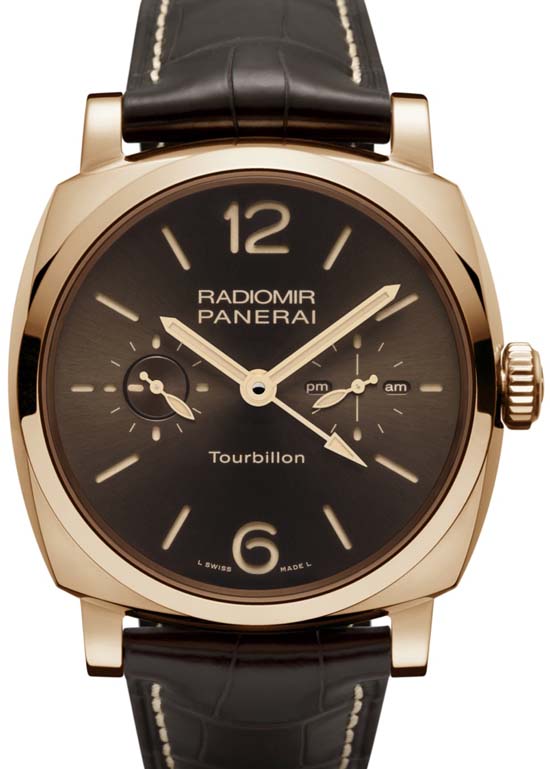 Officine Panerai unveiled at Watches and Wonders 2014 in Hong Kong, the Radiomir 1940 Tourbillon GMT Oro Rosso 48mm (PAM00558). At the exterior the Radiomir 1940 case with a diameter of 48 mm is made entirely of 5Npt red gold; with a high percentage of copper and platinum, giving the gold a warm, elegant tone which helps also to prevent oxidation. The dial is brown with a satiné soleil finish, featuring luminous Arabic numerals and hour markers.