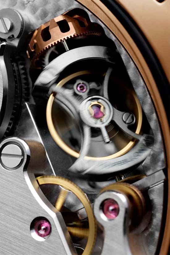 Dial: Brown, with luminous Arabic numerals and hour markers. 24h indicator at 3 o’clock, seconds and tourbillon indicator at 9 o’clock.