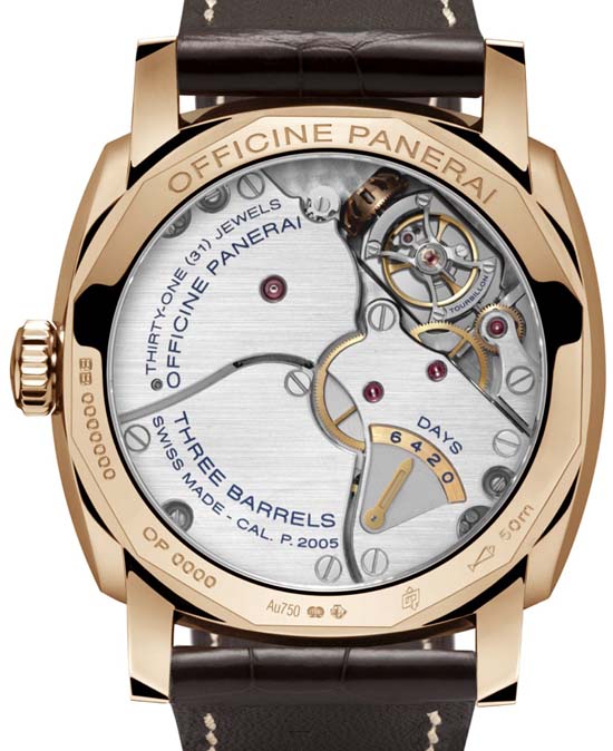 Movement: hand-wound mechanical, Panerai P.2005 calibre, executed entirely by Panerai, 16¼ lignes, 9.1 mm thick, 31 jewels, Glucydur balance, 28,800 alternations/hour. KIF Parechoc anti-shock device. Power reserve 6 days, three barrels. 239 components.