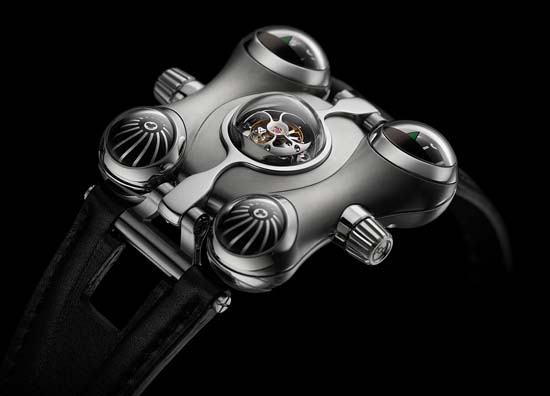MB&F (Maximilian Büsser and friends) is introducing their sixth Horological Machine HM6 ‘Space Pirate’, a timepiece designed to operate in the hostile environment of space. The biomorphic case manufactured by Les Artisans Boitiers Ti-6Al-4V is machined from Grade 5 titanium alloy that is highly anti-corrosive and thermally anti-conductive, capped top and bottom by transparent sapphire crystal domes. Inside is a three-dimensional horological engine developed exclusively for HM6 by MB&F with David Candaux Horlogerie Créative, with 68 jewels and a power reserve of 72h. The flying tourbillon in the center comes complete with a retractable shield. The masterpiece comes with a hand-stitched calfskin strap with titanium custom designed folding buckle. Priced at $230,000 the MB&F HM6 Space Pirate in Grade 5 titanium will be released in a limited edition of only 50 pieces. For more information, visit MB&F online.