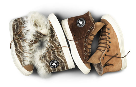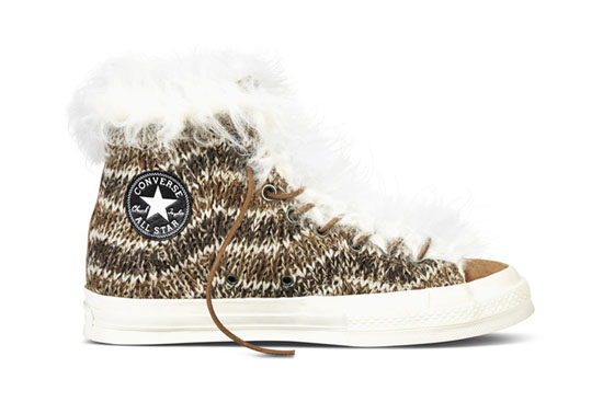 “The Converse All Star Chuck ‘70 Missoni Zip Shearling takes internal warmth to the next level by encasing the foot with a wild and luscious sheep wool lining. The uncut shearling protrudes from behind the laces and out of the ankle opening, and is intended to be worn either as a statement, or trimmed down for a more muted, personalized finish. This unique silhouette is complimented with a brown zigzag stripe Missoni upper, which is infused with dashes of white, and the soft fibers are flax-wrapped before being knitted for extra durability.”