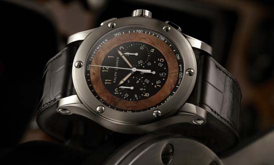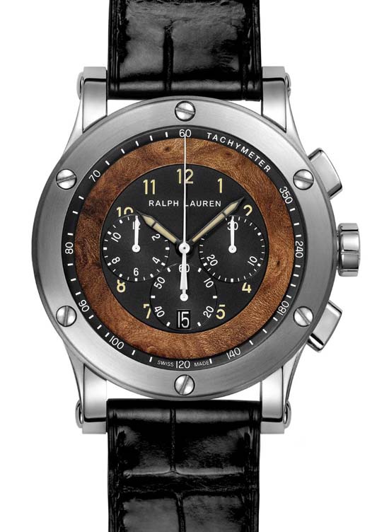 SIHH 2015 preview… Inspired by the instrument panel of Ralph Lauren’s legendary 1938 Bugatti Type 57SC Atlantic Coupe, the American fashion designer introduces the Ralph Lauren Automotive Chronograph. The watch features a 44.8mm round brushed stainless steel case with fixed bezel and six exposed screws; It has a convex AR-coated sapphire crystal, a sapphire display back, and it is water resistant to 50 meters. The dial is matte black, with an elm burl disc separating the centered hours and the outer tachymeter scale. The watch is powered by the new Swiss automatic movement Ralph Lauren, caliber RL751A/1 with 39 jewels, 28,800 vph and a power reserve of 65 hours; an automatic movement that’s exclusively made for Ralph Lauren by Jaeger-LeCoultre The novelty is supplied on a black alligator strap with black Alsavel lining and a stainless steel pin buckle. No word on price. TBA