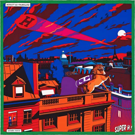 “Super H” – French luxury brand Hermes has released an animated short visual for their new superhero-themed scarves; in which the scarf becomes a superhero flying through the night sky. Designed by Dimitri Rybaltchenko, the new collection is inspired by comic books and feature the same rooftop theme in six color variations. Priced at $330.00 the Hermès vintage silk twill scarf is sized at 28″ x 28″ and available in Hermes boutiques and online. Watch the short film after the break.