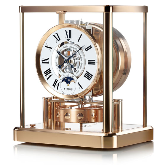 Atmos clocks are technical brilliant. Invented in 1928 by Jean-Léon Reutter, and then perfected and manufactured by Jaeger-LeCoultre, this horological marvel is the Jaeger Le Coultre Atmos Classique Phases de Lune. Housed in pink gilt cabinet, it invites one to contemplate the phases of the moon. The fascinating functioning of this mechanism, Jaeger-LeCoultre Calibre 562, crafted and assembled by hand counts the hours, day after day, year after year, without any need for a battery or rewinding – this is a clock that literally lives on air, drawing its energy from variations in temperature. Its indication is so accurate that it will register a difference of only one day in every 3,821 years. The Atmos Classique Phases de Lune in pink gold is priced at $9,800.