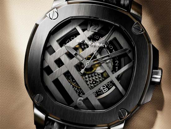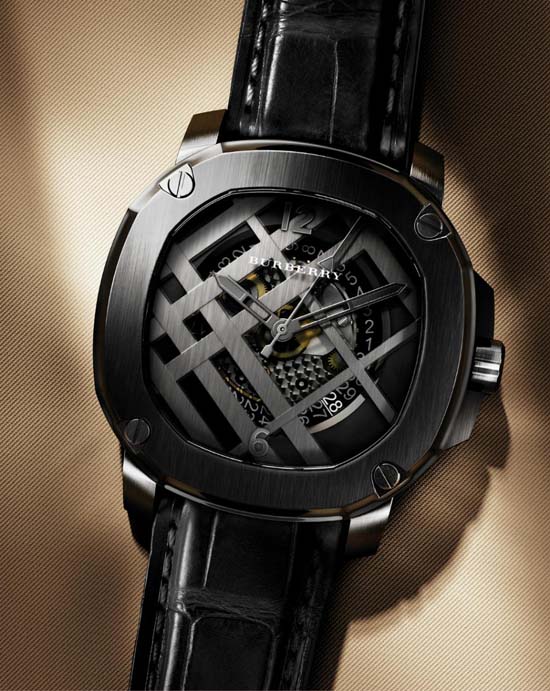 Pre-Basel 2015 – Burberry is introducing a new timepiece, the Britain Icon Check for men limited edition – as part of the brand-new The Britain Icon Check collection designed by Christopher Bailey. Housed in a 45 mm polished and brushed anthracite DLC-treated titanium case, it has an AR-coated sapphire crystal and is water resistant to 50 meters. Inside is a modified Swiss manual-wind ETA caliber 2878, with 17 jewels, beating at 28,800 vph and a power reserve of 42 hours. The check-shaped skeleton dial has a woven-effect openworked anthracite grid and black hands, providing tantalising glimpses of the mechanical calibre and its Côtes de Genève decoration. The timepiece comes in a limited edition of only 20 pieces. Any takers?