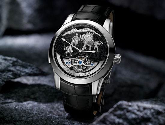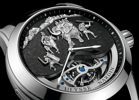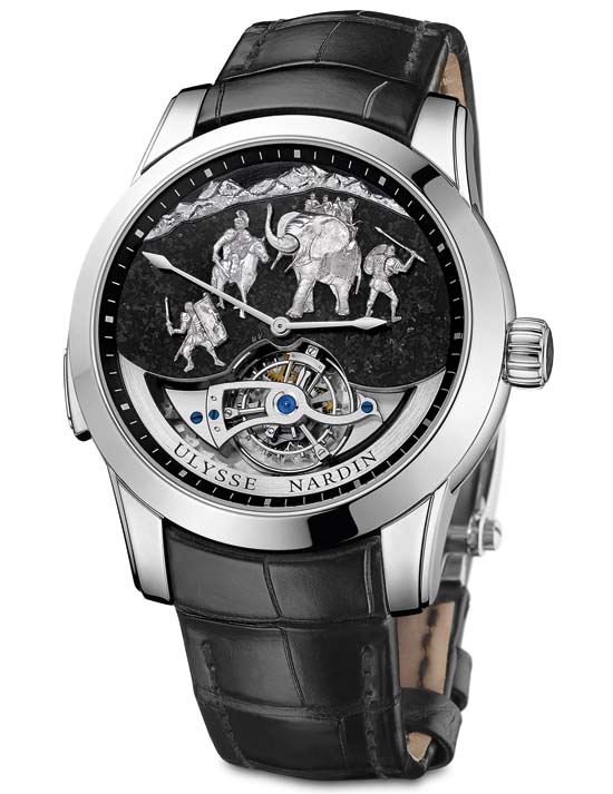 Pre-Basel 2015 – Ulysse Nardin marches forward in revolutionizing the industry with the “Hannibal” Minute Repeater Westminster Carillon Tourbillon Jaquemarts. Limited edition of only 30, the timepiece is housed in a 44 mm case crafted from platinum with genuine granite from the Alps on the dial. The most unforgettable impression of this work of art is made when viewing its dial, the Swiss manufacturer delights us with a piece of history – the dial features the great Carthaginian general Hannibal Barca, straddling his horse, appears to be in swift action with one of his loyal elephants and regiment of warriors by his side.