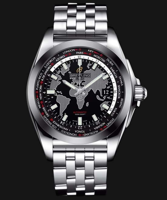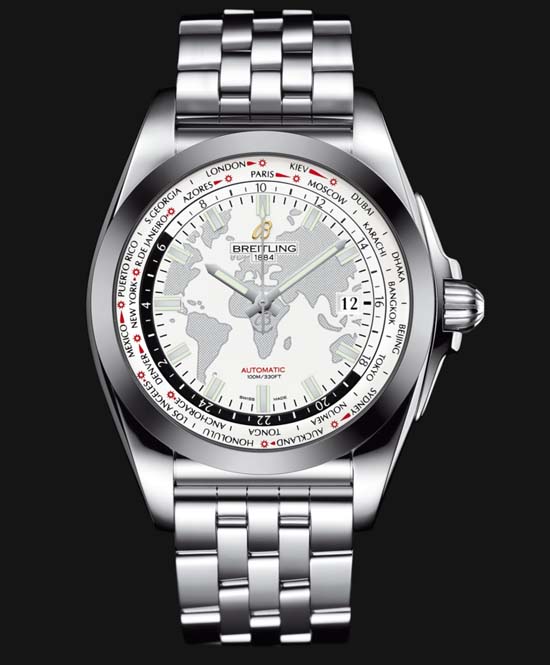 Breitling introduced another new timepiece today, the Galactic Unitime SleekT, a sporty, travel-friendly and sophisticated watch. Featuring a 44mm Steel with tungsten carbide bezel the timepiece is available in two versions Trophy Black and Antarctica White dial. Inside is a technical breakthrough, the new selfwinding worldtime movement B35 “in-house” caliber with 41 jewels, beating 28 800 v.p.h and a power reserve of Min. 70 hrs. Completing the ensemble is a pilot steel strap. I always like it when Breitling gives a nod to its heritage. NO word on price yet. TBA