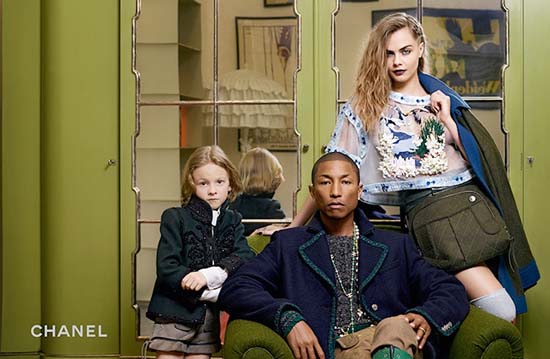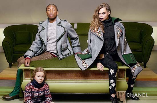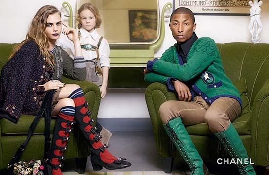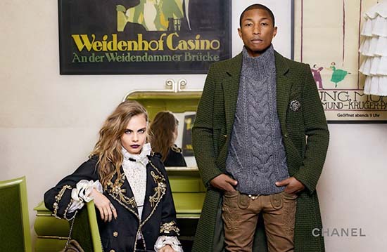 Karl Lagerfeld has tapped Pharrell, Cara Delevingne and the adorable Hudson Kroenig, son of Brad Kroening to model Chanel’s 2015 Paris-Salzburg campaign. Photographed by Chanel creative director Karl Lagerfeld, the trio dons luxe knits, embellished coats and iconic tweed designs paired with Austrian touches. What do you think of Pharrell’s knee high lace up boots?