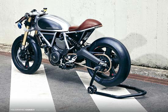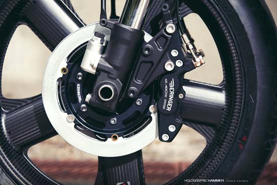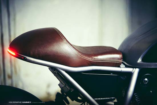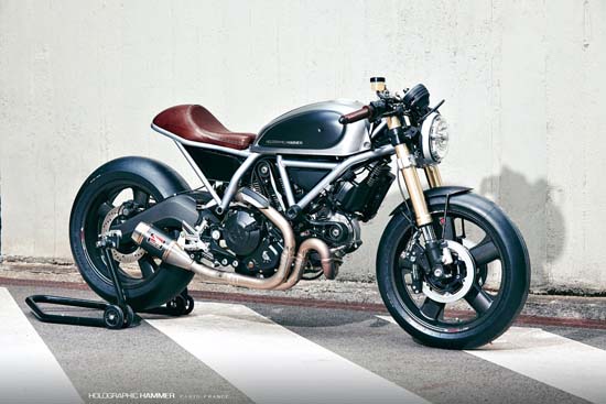 Holographic Hammer unveiled their first official take on the Ducati Scrambler, just in time for the Wheels & Waves festival in France. Commissioned by Ducati themselves, in partnership with French magazine Moto Heroes, the motorcycle is outfitted with Rotobox 17” carbon racing wheels, nicely fitted with Pirelli sport rubber, 4D System racing brakes by Beringer, while the rear frame loop with an integrated LED tail light and turn signals comes from Cognito Moto.
