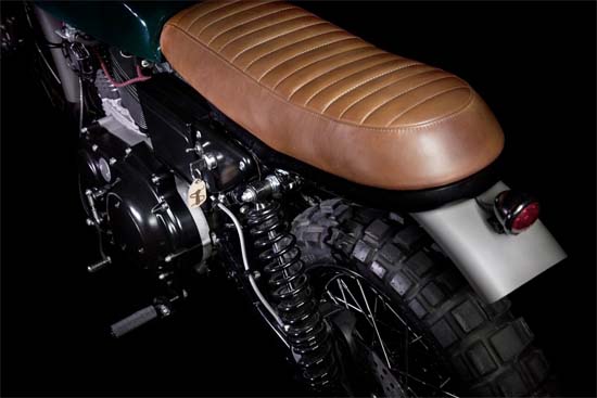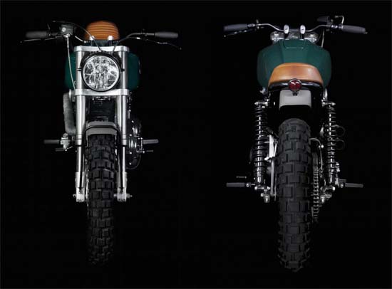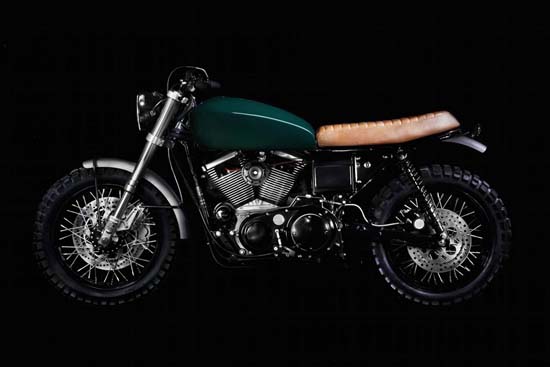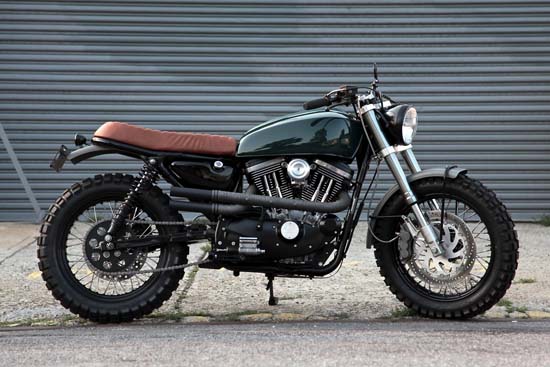 This impressive ride is the work of Brooklyn-based motorcycle workshop VDB Moto. Based on a Harley-Davidson 99’ Sportster 1200, the scrambler features an entirely new front end, using a new set of Showa inverted forks attached to a custom set of aluminum triple trees, 18-inch wheels, micro LED indicators, a big old 77’ Hondamatic tank painted with a pastel Jaguar green, a custom leather seat and more.