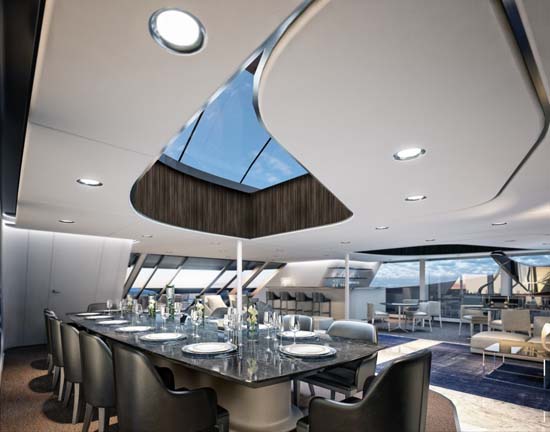 Italian shipbuilder Fincantieri has unveiled in collaboration with Pininfarina a new 85 metre superyacht concept at the Monaco Yacht Show 2015. This luxury yacht features 5 decks, twin pools on the main deck , exclusive interior fittings and has room to accommodate comfortably 14 guests and a 19 crew members.