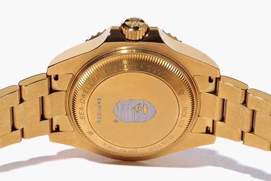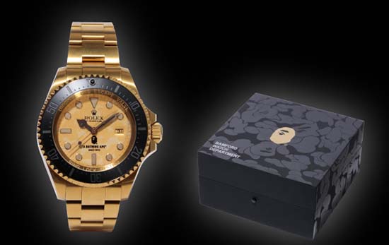 London-based watch customizer Bamford Watch Department collaborated with A Bathing Ape to create a custom Rolex Deepsea timepiece for Bape’s FW15 luxury line, A Bathing Ape Black. Housed in a 44 mm case, this special-edition watch features a smooth matte-finished bezel and a Bape Camo pattern on the dial, complemented by the brand’s iconic ape head logo. Limited to just four pieces, the Bape Black x Bamford Watch Department Rolex Deepsea will be available at select locations, including Bape stores in Harajuku and New York, as well as select I.T. boutiques.