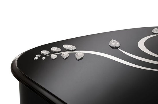 The Heliconia pattern on the piano was originally created by Marie-Claude Lalique, granddaughter of René Lalique.