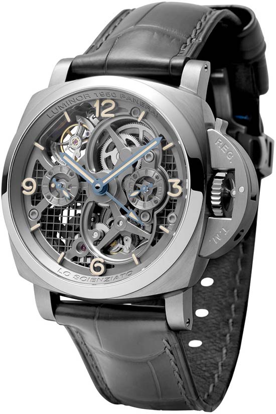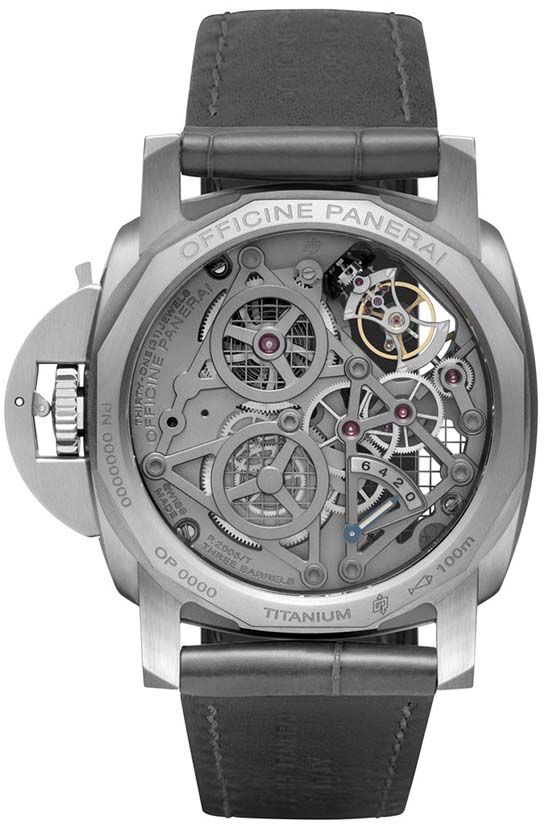 Officine Panerai presented at SIHH 2016 “Lo Scienziato” a skeletonised tourbillon collection, dedicated to the Tuscan genius Galileo Galilei. Housed in a 47mm, brushed titanium case protected by a sapphire crystal formed of corundum. Inside is the first Panerai tourbillon calibre in titanium with fine skeletonized bridges and plates, P.2005/T calibre, executed entirely by Panerai, beating at 28,800 A/h (4 Hz) with 144 hour power reserve. Completing the ensemble is a grey alligator strap with a adjustable brushed titanium buckle. Limited Edition of 150 Pieces. Unfortunately, pricing hasn’t been revealed yet. TBA .