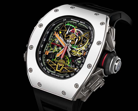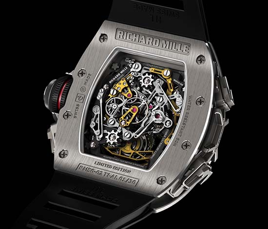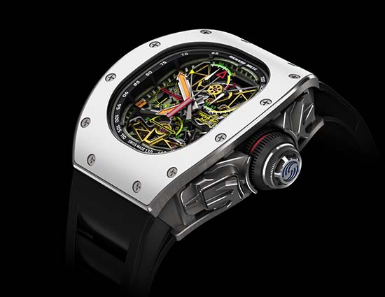 Richard Mille introduced at SIHH 2016 in collaboration with Airbus’ private jet division this new and truly amazing timepiece: Richard Mille RM 50-02 ACJ Tourbillon Split Seconds Chronograph . Housed in a case from made in Titanium-Aluminum (TiAl) measuring 50.10 x 42.70 x 16.50 mm, the case incorporates jet design elements like the wheel and tire-style crown, Airbus ACJ logo and other symbols on the side of the case.