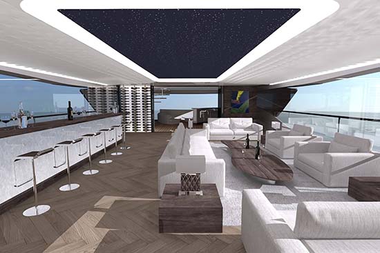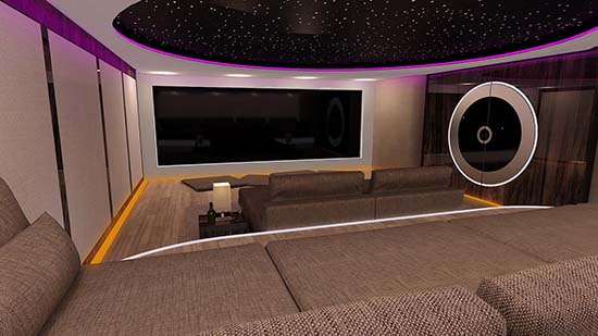 The cinema on the Benetti Fisker 50 concept has a giant screen and reclining beds that accommodate 12.