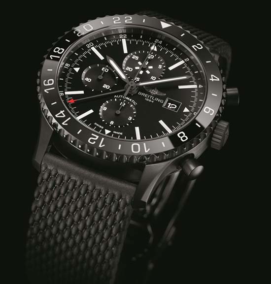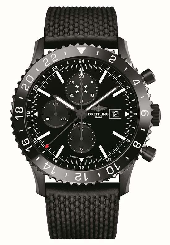 Inspired by a watch from the 1950s-1960s, Swiss watchmaker Breitling unveiled a technical and elegant uniform for the authentic flight captain’s watch, the Chronoliner Blacksteel. Housed in a black steel case measuring 46mm with a ceramic bezel, it has an AR-coated sapphire crystal and it is water resistant to 100 meters. Inside is the Swiss automatic Breitling caliber 24 with 25 jewels, 28,800 vph and a power reserve of 46 hours. It is COSC-certified as a chronometer chronograph, and features a chronograph and GMT complications. Completing the ensemble is a black Aero Classic rubber strap with black steel buckle. No word on price. TBA.