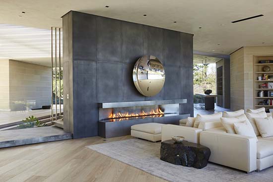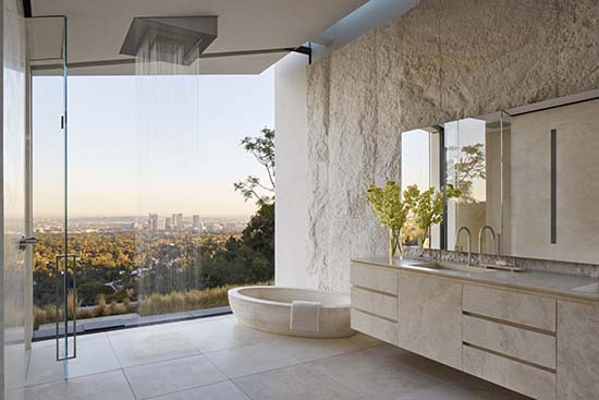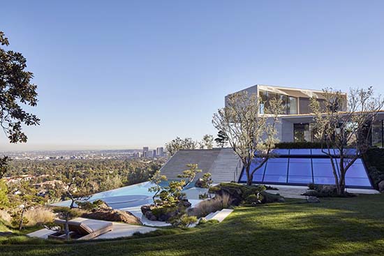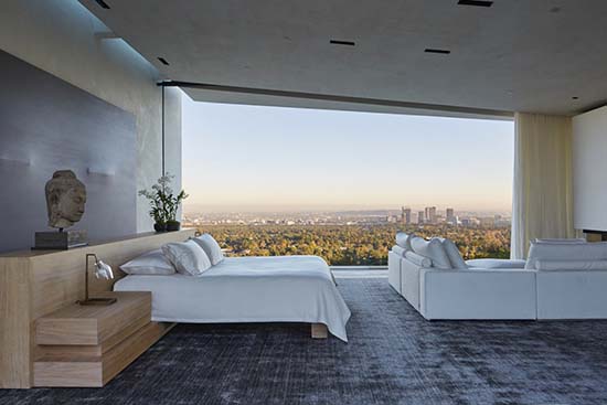 Today we get our first look at Michael Bay’s Los Angeles Villa. Originally created by Chad Oppenheim, the founder of the Oppenheim architecture firm, the three-story house spans across a whopping 30,000-square-feet. Offering spectacular views of both downtown Los Angeles and the Santa Monica mountain range in the distance, the gorgeous villa houses a large parking space, a movie prop museum, a 50-seat movie theater designed by Jeff Cooper, a spa and several bedrooms, plus two master bedroom modules that hover above the rest of the building. The swimming pool dramatically establishes the cliff’s edge, even extending beyond it at one end. Scan through the cinematic home below.
