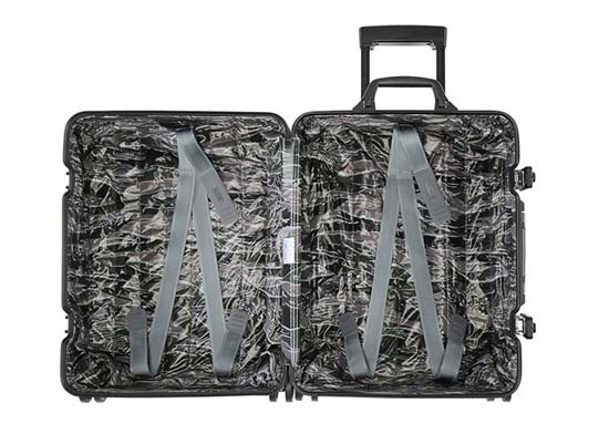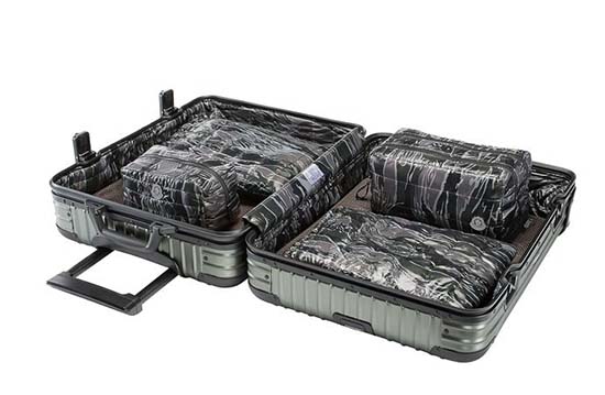 Moncler has teamed up once again with German premium luggage brand Rimowa for the Rimowa x Moncler “Topas Stealth” aluminium luggage range. Available in three sizes: Size 52 (32L volume), Size 56 (45L volume) and Size 63 (64L volume) the line comes in a beautiful gunmetal grey colorway with black trim, while the interior has been beautifully customized, featuring a quilted camouflage lining. The luxury cases are available for sale online now on moncler.com and in select Moncler and Rimowa boutiques worldwide.
