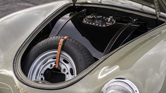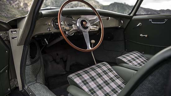The interior looks stock and original, is dressed in green leather upholstery with tartan center panel on Speedster seat.